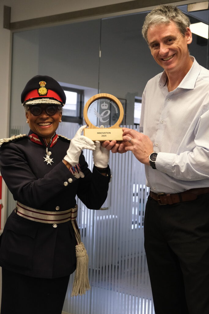 Mrs Peaches Golding OBE CStJ, His Majesty’s Lord-Lieutenant for Bristol, visited the Inductosense headquarters this week, accompanied by one of her cadets, to present the award in an official ceremony which recognises the company’s outstanding achievement in innovation.